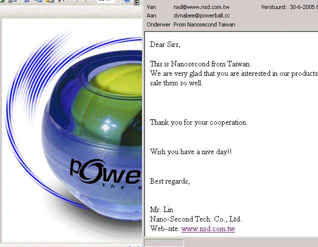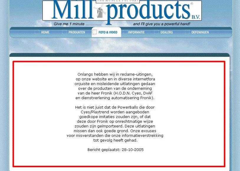 Wij verkochten dhr. van Meulen immers onze turbopro powerballs van Dynabee. Zie bewijs van betaling eerste levering. november 2001 dus ook de heer van Meulen van Mill products is door ons toedoen voor het eerst met de powerball in aanraking gekomen. En heeft dit product als zo succesvol gezien om daar zelf een handel mee op te zetten. ( waar wij het natuurlijk volledig mee eens zijn!)
